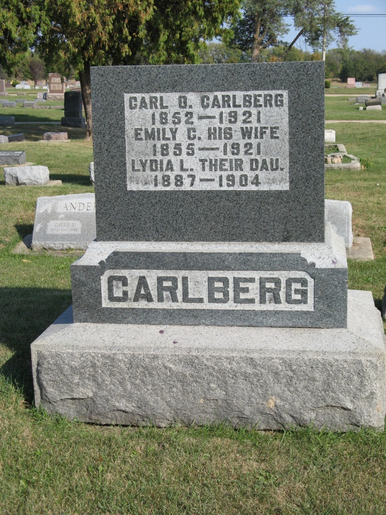 Carl O Carlberg 1852-1921, Emily C his wife 1855-1921, Lydia L their dau. 1887-1904; Linwood Cemetery, Galesburg, Knox County, IL.