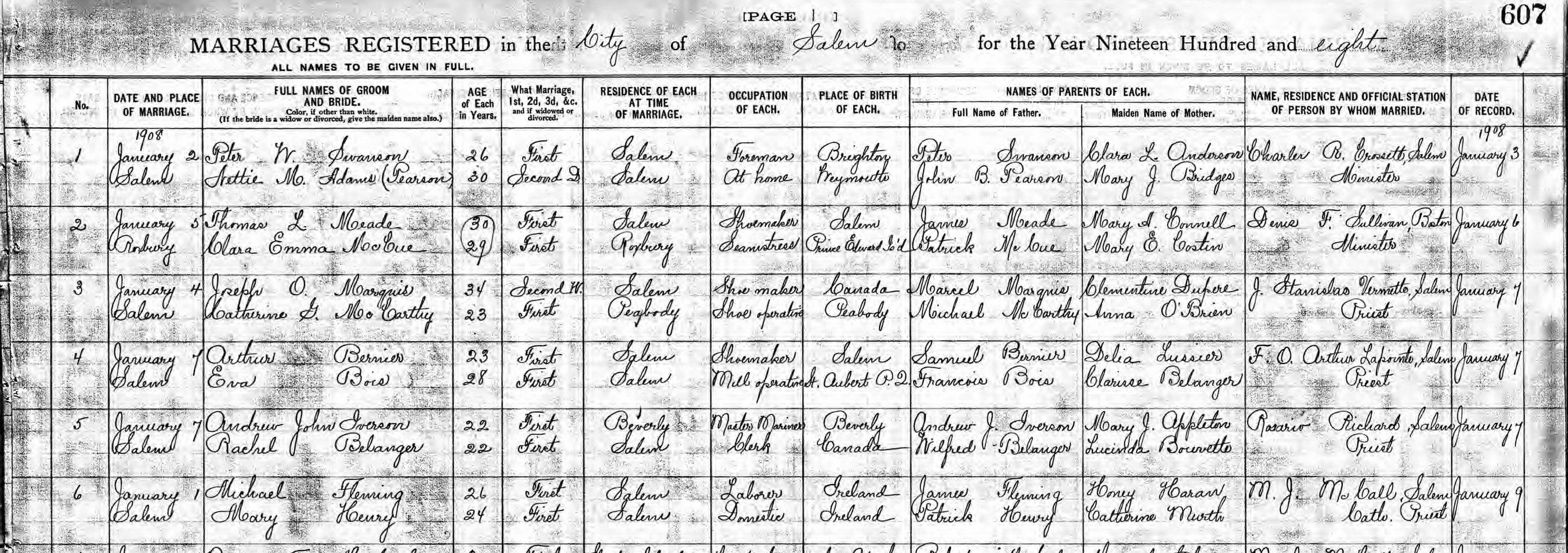 Marriage Notes: Ancestry.com. Massachusetts, Marriage Records, 1840-1915 [database on-line]. Provo, UT, USA: Ancestry.com Operations, Inc., 2013. Marriages Registered in City of Salem for 1908. page 607, No. 6: • Groom: Michael Fleming, age 26, First Marriage, Reside in Salem, Occ: Laborer, Birthplace: Ireland, Father: James Fleming, Mother: Honey Haran. • Bride: Mary Henry, age 24, First Marriage, Reside in Salem, Occ: Domestic, Birthplace: Ireland, Father: Patrick Henry, Mother: Catherine Murtha. • Marriage: 1 Jan 1908 in Salem, Massachusetts by M. J. McCall, of Salem, Catholic Priest -------------------------