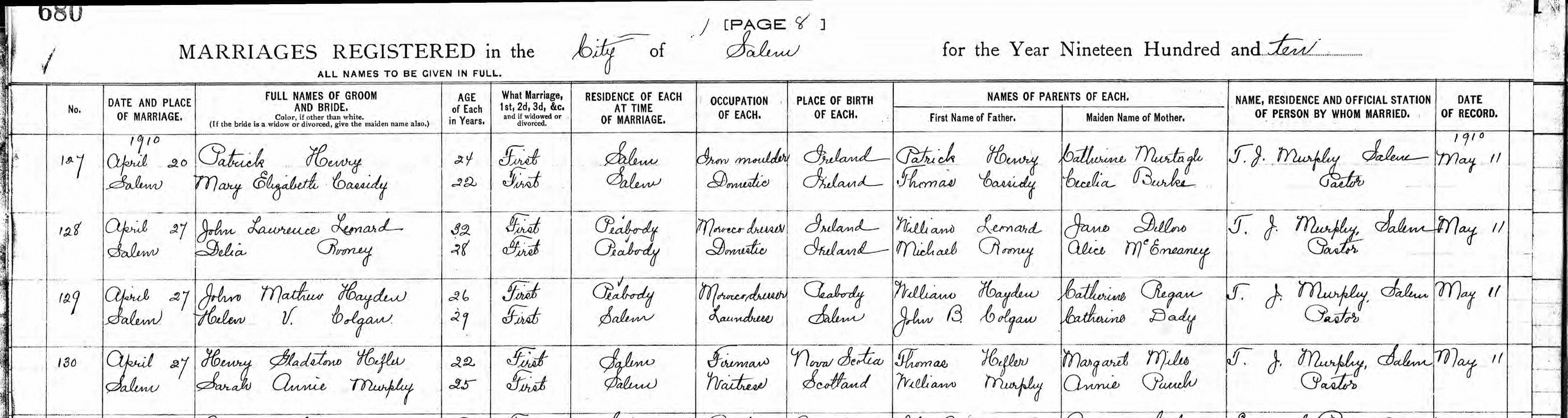 Marriage Notes: Thomas F. Henry's Little (abt 4.5" x 2.25") Black Book of personal note Page 7: Patrick Henry3rd Married Mary Cassidy April 20th 1910 ----------------------------------------------------------------------------------------------------- Ancestry.com. Massachusetts, Marriage Records, 1840-1915 [database on-line]. Provo, UT, USA: Ancestry.com Operations, Inc., 2013. Marriages Registered in City of Salem, for 1910, Page 8 - (680), Line 1, No. 127: • Groom: Patrick Henry, age 24, 1st marriage, Residence: Salem, Occ: Iron moulder, born in Ireland, Father: Patrick Henry, Mother: Catherine Murtagh. • Bride: Mary Elizabeth Cassidy, age 22, 1st marriage, Residence: Salem, Occ: Domestic, born in Ireland, Father: Thomas Cassidy, Mother: Cecelia Burke. • Marriage: 20 Apr 1910 in Salem, Massachusetts by Fr. T. J Murphy, Pastor, of Salem. -----------------------------------------------------------------------------------------------------